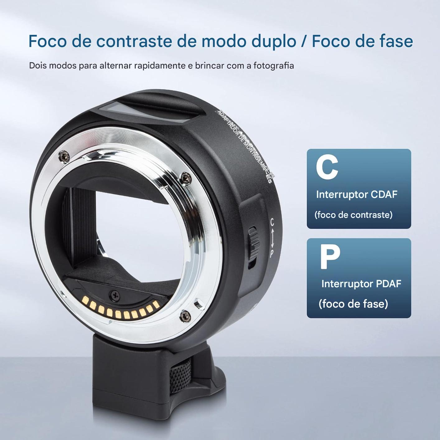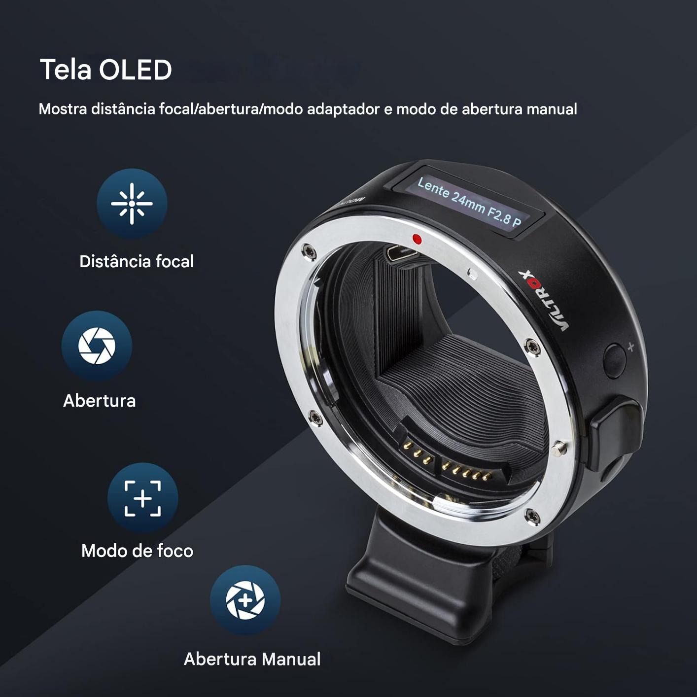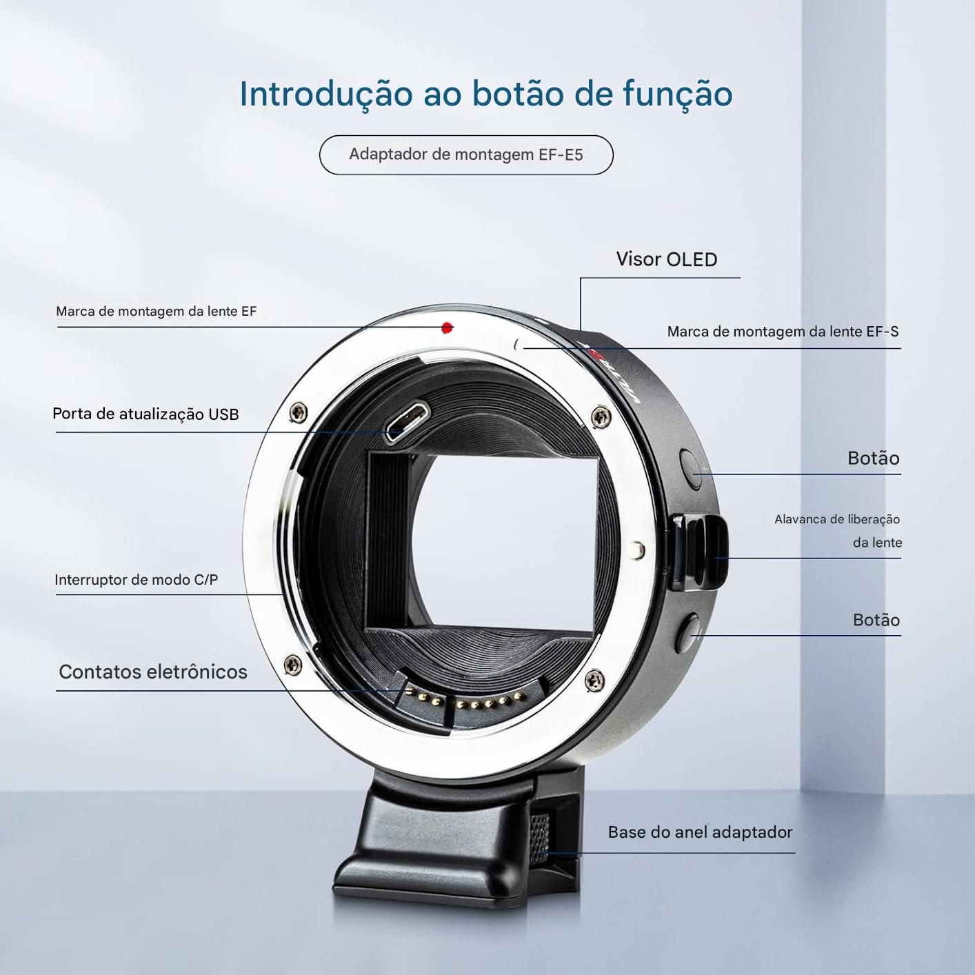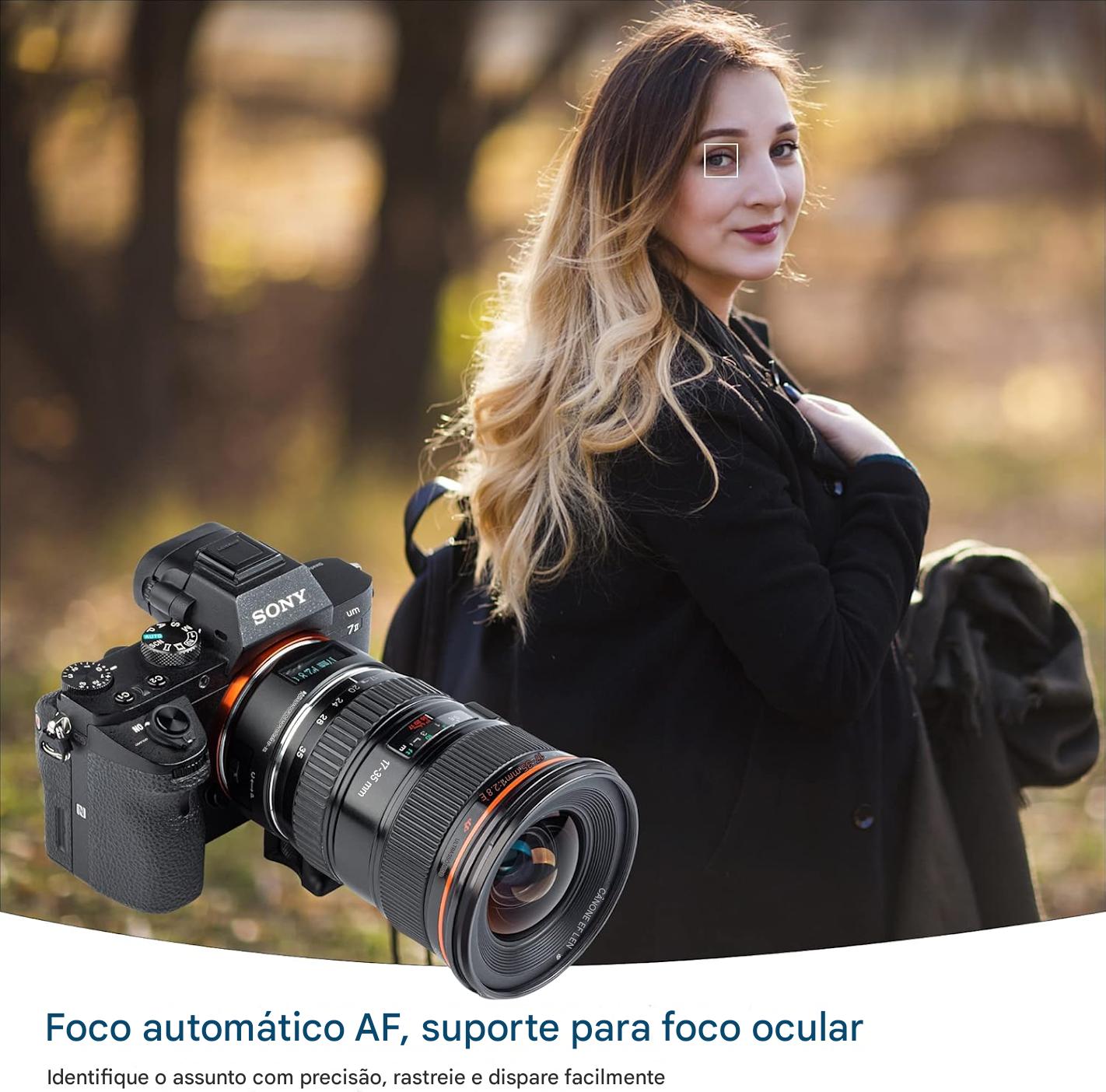 O Adaptador Viltrox EF-E5 é a solução ideal para fotógrafos e cinegrafistas que desejam utilizar lentes Canon EF e EF-S em câmeras Sony com montagem E-Mount. Equipado com transmissão eletrônica avançada, ele mantém a comunicação completa entre a lente e a câmera, permitindo controle total de foco automático, estabilização de imagem e ajustes de abertura diretamente pelo corpo da câmera. Seu design robusto e sofisticado conta com um anel de controle de abertura e uma tela OLED integrada, que exibe informações em tempo real, proporcionando mais praticidade e precisão no uso. Além disso, o adaptador possui suporte para atualização de firmware via USB, garantindo compatibilidade contínua com novos modelos de câmeras e lentes. Fabricado com materiais de alta qualidade, oferece um encaixe seguro e preciso, sendo a escolha perfeita para expandir as possibilidades criativas de quem trabalha com múltiplos sistemas de lentes.