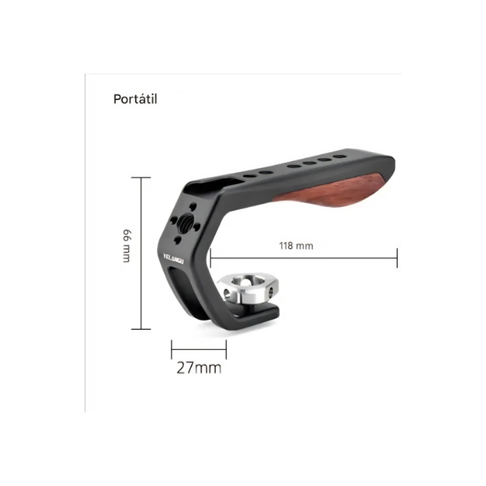 A Top Handle com Alça Superior de Madeira e Aço é um acessório projetado para oferecer maior conforto, controle e estabilidade durante filmagens manuais, sendo compatível com câmeras DSLR, câmeras de vídeo e rigs para smartphones. Seu design ergonômico e robusto, feito com uma combinação de madeira e aço, garante um excelente equilíbrio entre resistência e conforto, reduzindo a fadiga do operador em longas sessões de gravação.