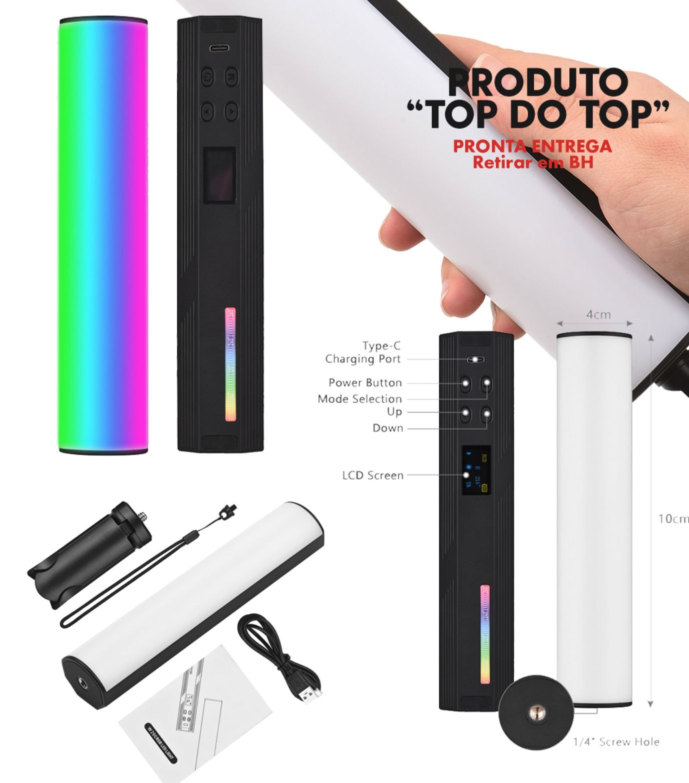 O bastão também vem equipado com modos de iluminação personalizáveis, permitindo ajustes de intensidade e efeitos especiais, como simulação de luz estroboscópica, flash e outros efeitos cinematográficos. Seu design compacto e leve o torna fácil de transportar, sendo uma escolha ideal para profissionais que precisam de mobilidade sem abrir mão da qualidade da iluminação.
