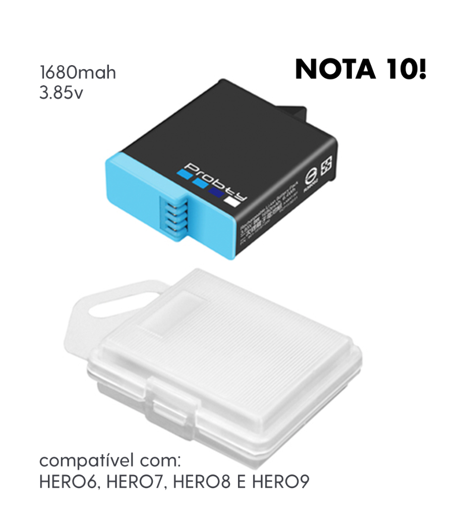 A Bateria GoPro – Probty é a solução perfeita para quem busca energia extra para suas câmeras GoPro Hero 6, 7, 8 e 9. Com alta capacidade e desempenho confiável, esta bateria proporciona longas horas de gravação em diversas condições de uso, desde filmagens em movimento até gravações de ação intensas.
