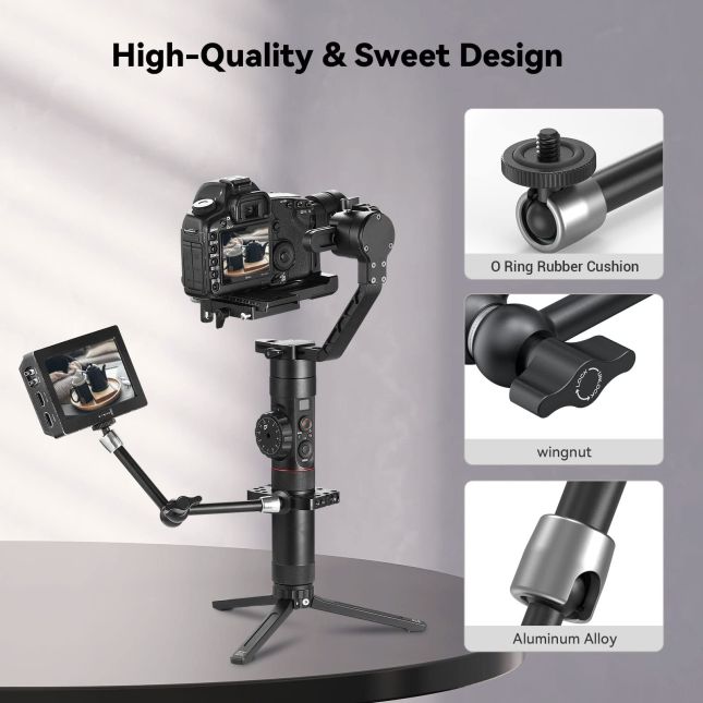 Fabricado com materiais de alta qualidade e design robusto, o SmallRig Articulated Arm oferece durabilidade e resistência, suportando diversos acessórios com segurança. Seu sistema de bloqueio de ângulos e rotação permite ajustes rápidos e precisos, proporcionando total liberdade na escolha da posição ideal para cada componente da sua configuração.