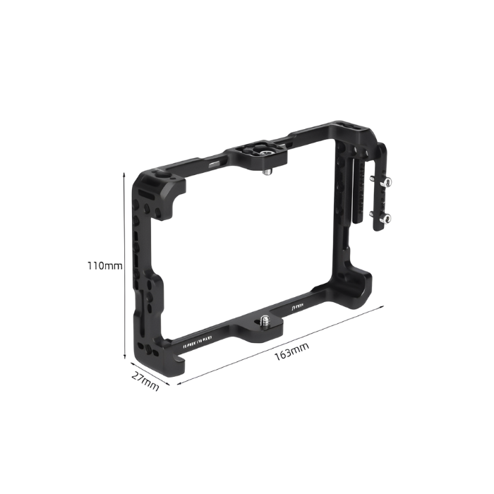 A Cage/Gaiola para monitores F5 Pro 5.5 e F6 Plus foi projetada para garantir proteção, estabilidade e praticidade no uso dos monitores durante filmagens. Construída em liga de alumínio de alta resistência, essa cage oferece uma estrutura robusta sem comprometer a portabilidade, sendo ideal para profissionais que precisam de segurança e versatilidade no manuseio dos equipamentos.