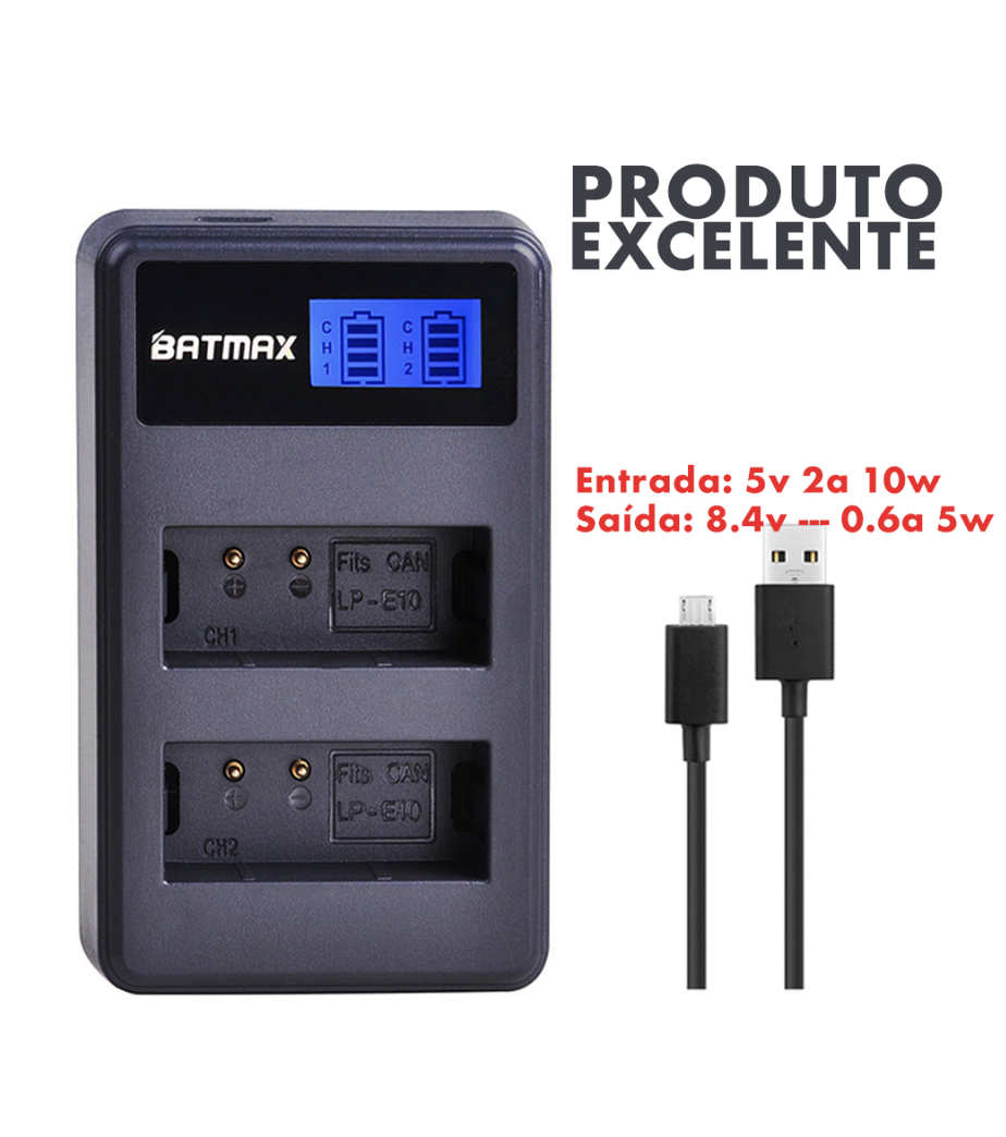 Com um design compacto e portátil, o Carregador Batmax LP-E10 pode ser facilmente transportado, tornando-se uma excelente opção para quem realiza trabalhos em locações externas, estúdios ou em ambientes onde a mobilidade é essencial. Ao escolher este carregador, você garante mais tempo de uso, sem se preocupar com a falta de carga em suas baterias durante suas produções.