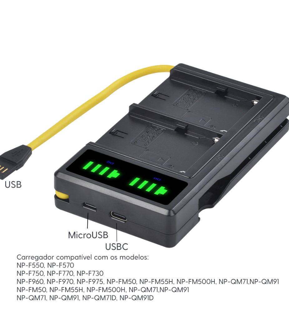 Com carregamento otimizado, esse carregador é uma excelente escolha para quem utiliza as baterias NP-F550 em equipamentos como câmeras, luzes LED e outros dispositivos compatíveis, proporcionando mais autonomia para suas gravações e filmagens.