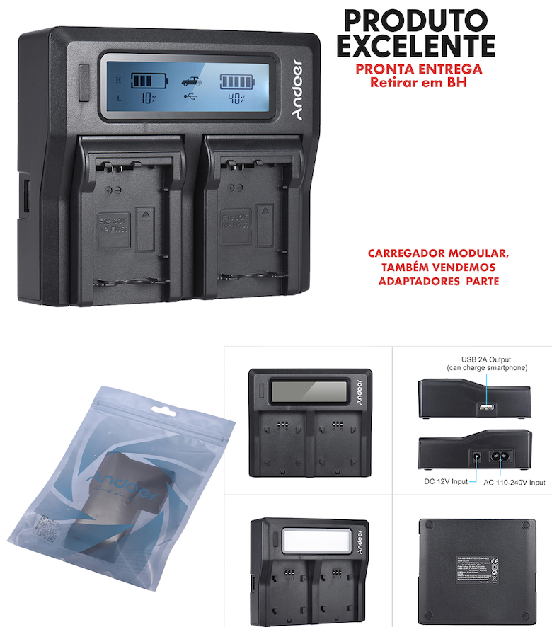 - Compatível com baterias NP para câmeras e equipamentos da marca Andoer