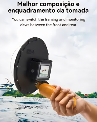 Seu design inclui uma cúpula de acrílico de alta transparência, que melhora a dispersão da água e evita distorções, garantindo imagens mais nítidas e vibrantes. O bastão flutuante incluso proporciona maior estabilidade e controle durante as capturas, facilitando o manuseio debaixo d’água.