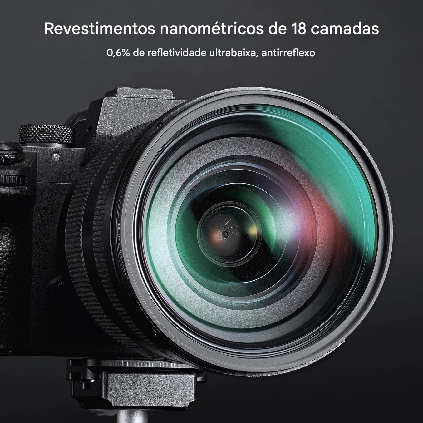 Além disso, o filtro é equipado com a tecnologia Nano-X, um revestimento multicamadas que minimiza o risco de manchas e melhora a resistência contra sujeira e poeira. Ele também oferece proteção extra contra reflexos indesejados, garantindo imagens mais limpas e nítidas, além de proteger sua lente contra danos físicos. A construção de alta qualidade e o design fino do filtro fazem com que ele seja fácil de montar e usar, mantendo a integridade da sua câmera e lente.