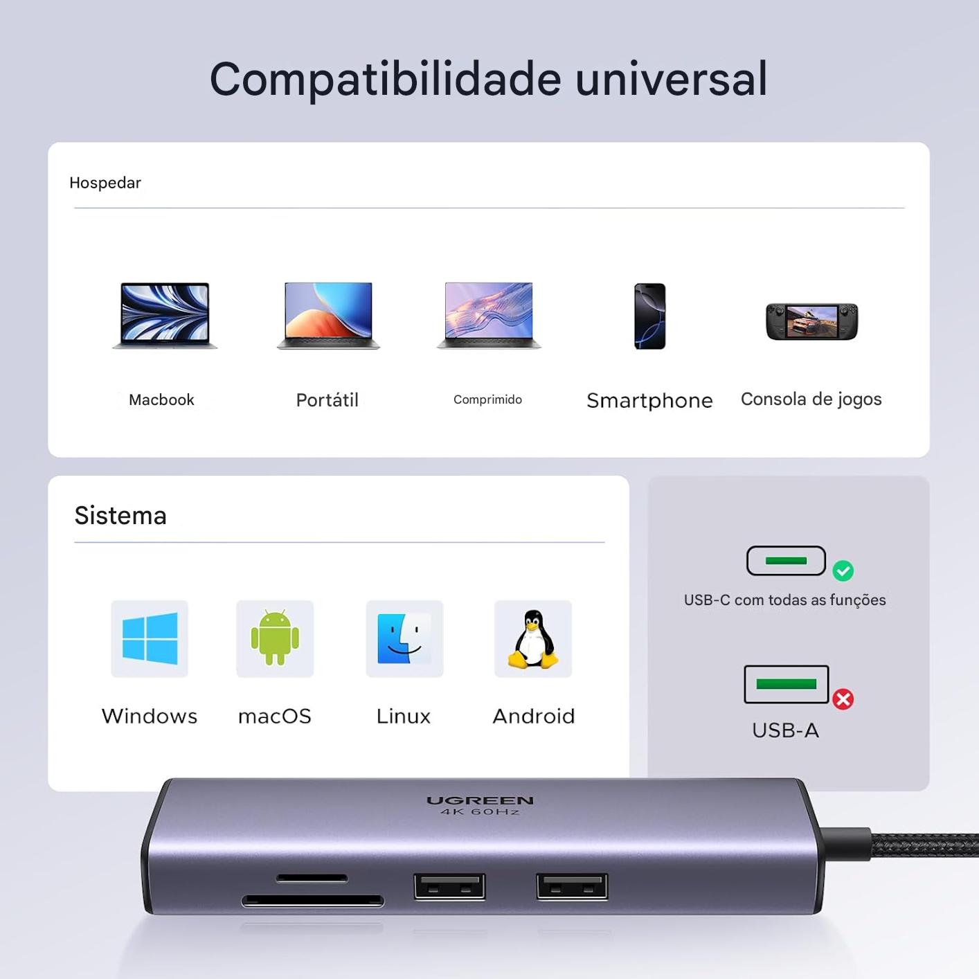 - Compatível com laptops, tablets, smartphones e outros dispositivos com porta USB-C