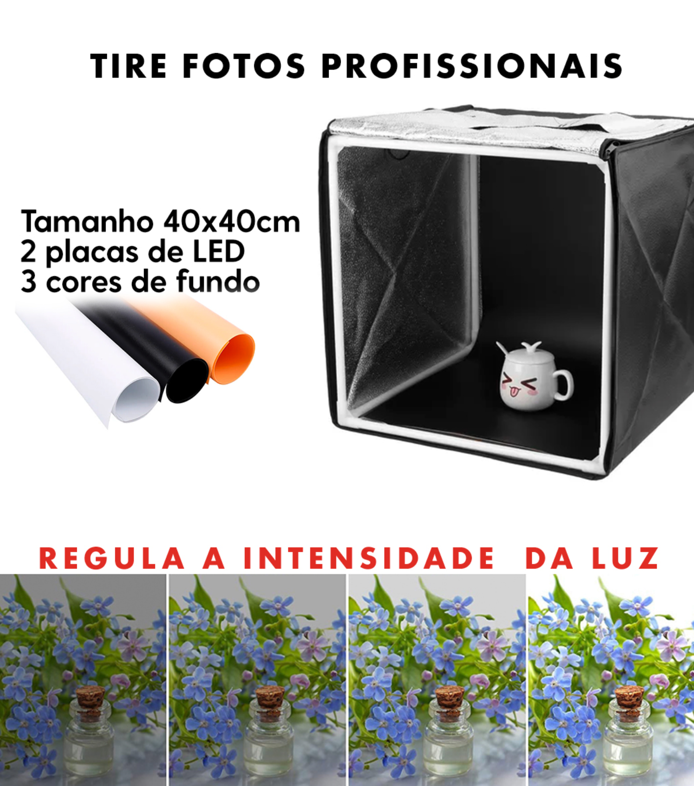 Este mini estúdio portátil vem com um sistema de luz LED embutido, que proporciona uma iluminação suave e ajustável, eliminando a necessidade de equipamentos adicionais. Seu design dobrável e leve torna o transporte fácil, permitindo que você tenha um estúdio fotográfico sempre à mão, sem comprometer o espaço de trabalho. A estrutura do mini estúdio é construída com materiais de alta qualidade, garantindo resistência e durabilidade ao longo do tempo, e pode ser montada em poucos minutos, oferecendo uma experiência prática e sem complicação para o fotógrafo.