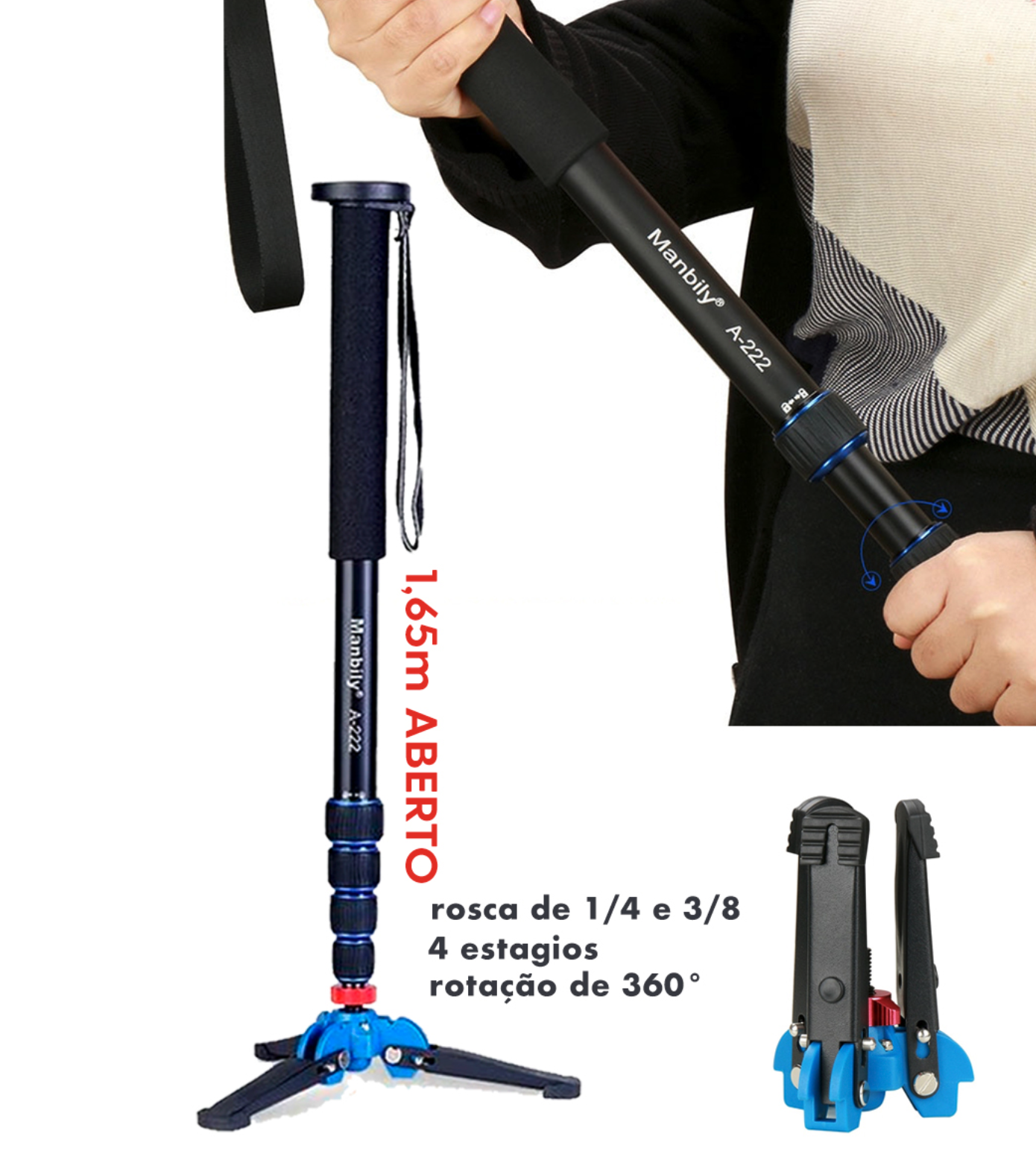 O Monopé Manbily A222 é a escolha ideal para fotógrafos e videomakers que buscam mobilidade e estabilidade em suas produções. Com estrutura resistente e design leve, ele proporciona suporte confiável para câmeras DSLR, mirrorless e filmadoras, permitindo capturas suaves e dinâmicas em diversas situações.