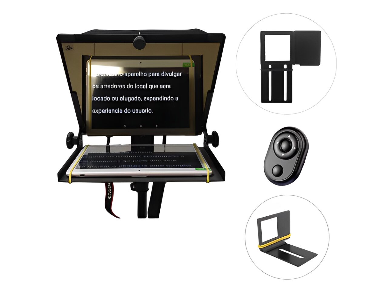 <ul> <li>Compatível com câmeras DSLR e mirrorless</li> <li>Suporte para tablets e smartphones de até 10,5”</li> <li>Suporte adicional para gravação com smartphone</li> <li>Tela reflexiva de alta transparência para leitura clara</li> <li>Estrutura leve e portátil, ideal para uso em estúdio ou locação</li> <li>Fácil montagem e ajuste para diferentes ângulos de filmagem</li> <li>Ideal para vídeos institucionais, transmissões ao vivo e conteúdo digital</li> </ul>Comprar -