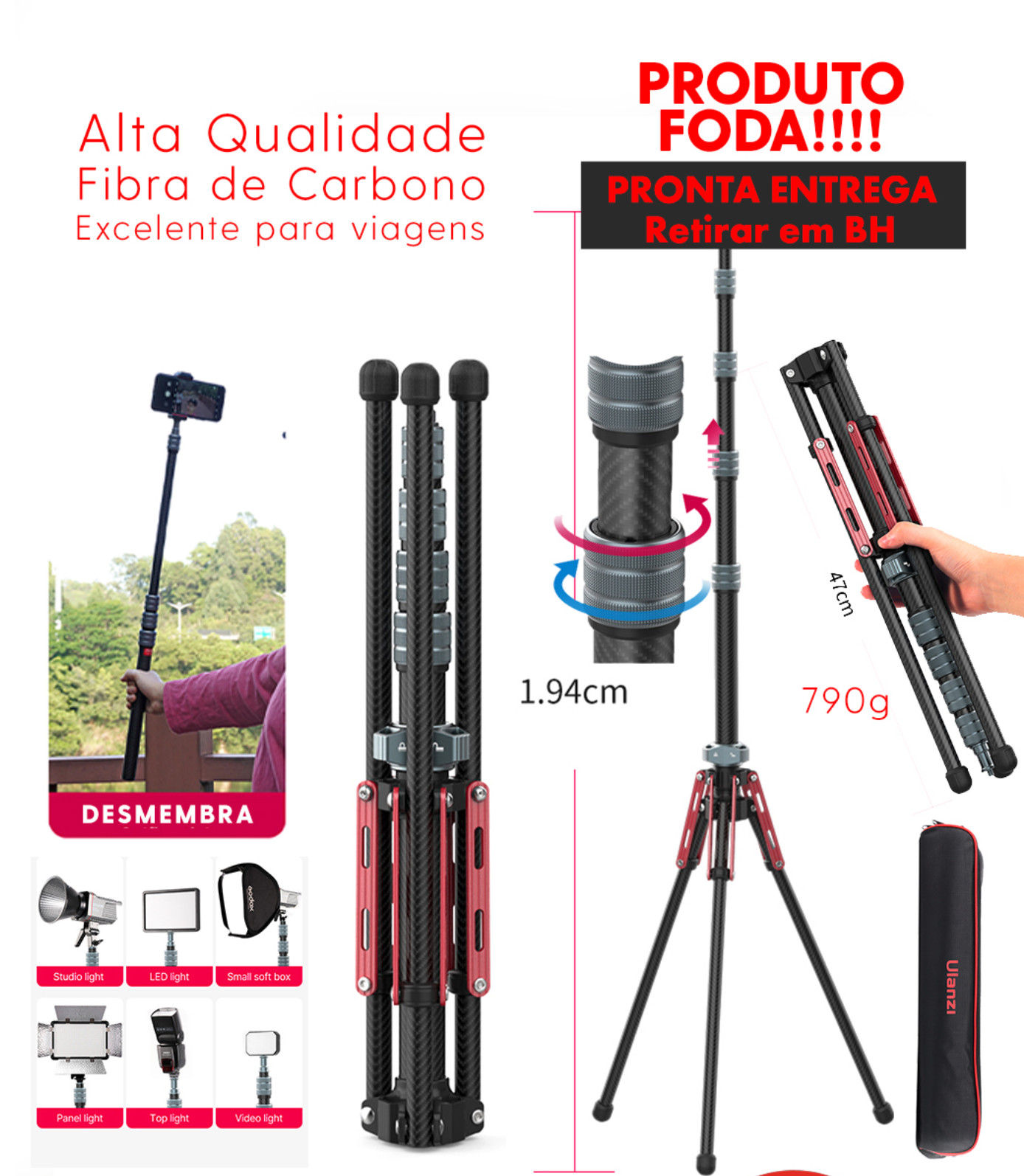 Compacto e leve, o tripé é fácil de transportar e armazenar, sendo ideal para profissionais que precisam de mobilidade sem abrir mão da qualidade e resistência.