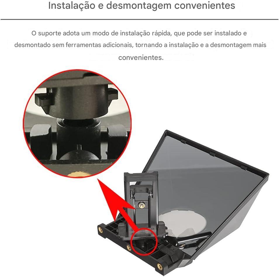 Com um design simples e prático, o TP2 proporciona fácil montagem e ajustes, adaptando-se rapidamente a diferentes tipos de equipamentos. Seu espelho reflexivo de alta qualidade garante uma leitura nítida do texto sem comprometer a clareza da imagem capturada pela câmera. O teleprompter permite que o apresentador leia o script enquanto olha diretamente para a lente, proporcionando uma sensação de diálogo com o público, essencial para vídeos de alto nível e apresentações de impacto.
